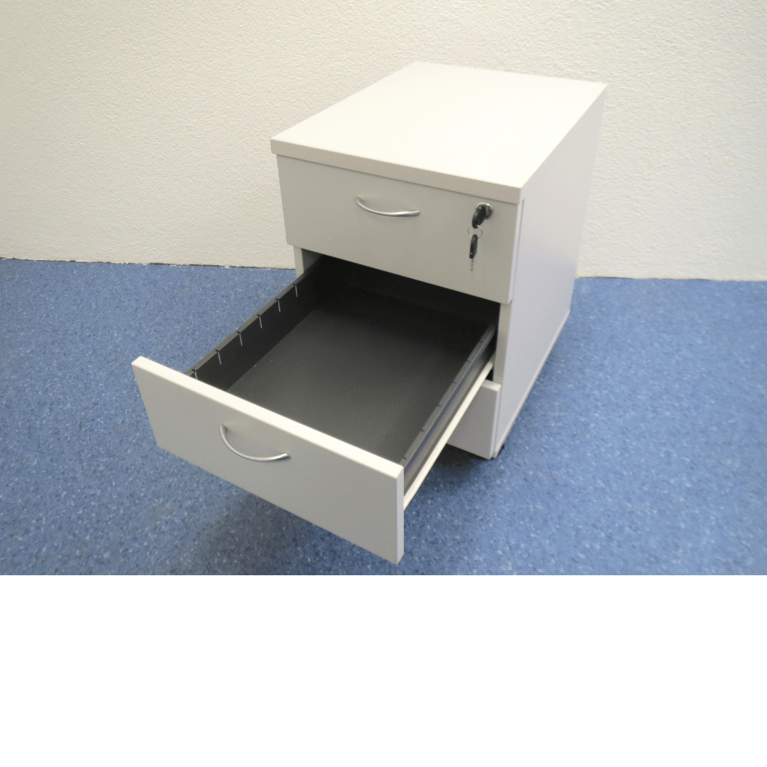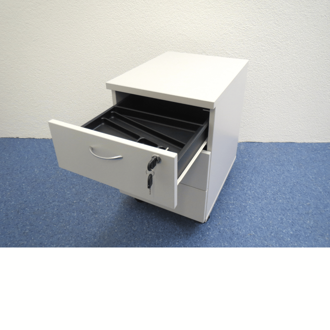 Dieser Korpus eignet sich ideal für die Organisation von Büromaterialien, Dokumenten und kleineren Gegenständen. Die Mobilität durch die Rollen macht ihn flexibel einsetzbar in verschiedenen Büroräumen und Kombinationen.