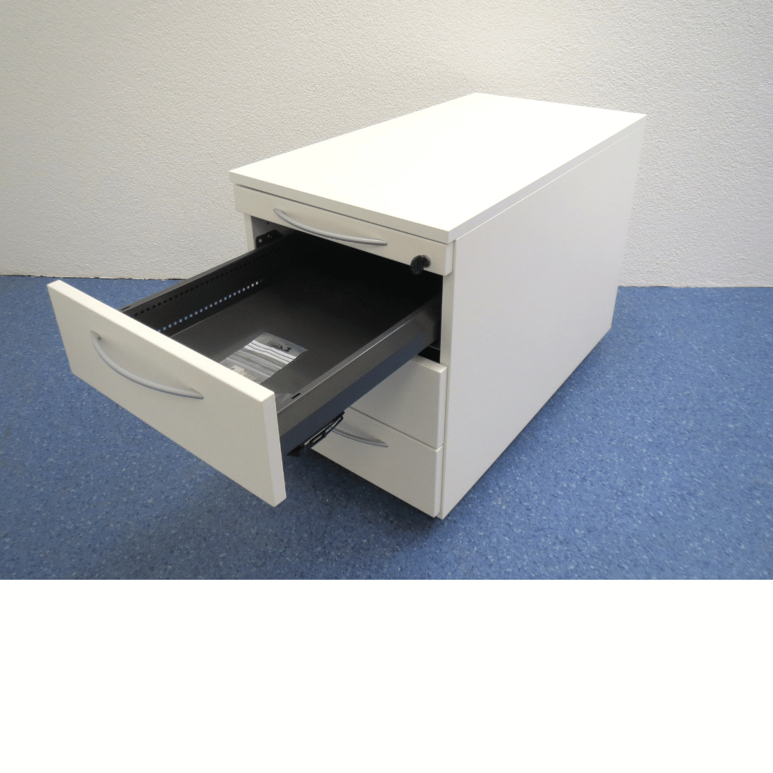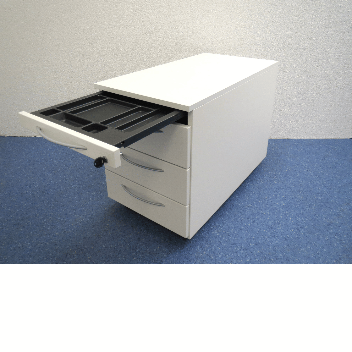 Das Möbelstück ist in Weiss ausgeführt und verfügt über silbergraue Griffe, die einen modernen Kontrast bilden. Die Oberfläche ist abschliessbar, was Sicherheit für vertrauliche Materialien bietet. Vier Rollen ermöglichen eine einfache Mobilität und Positionierung im Raum.