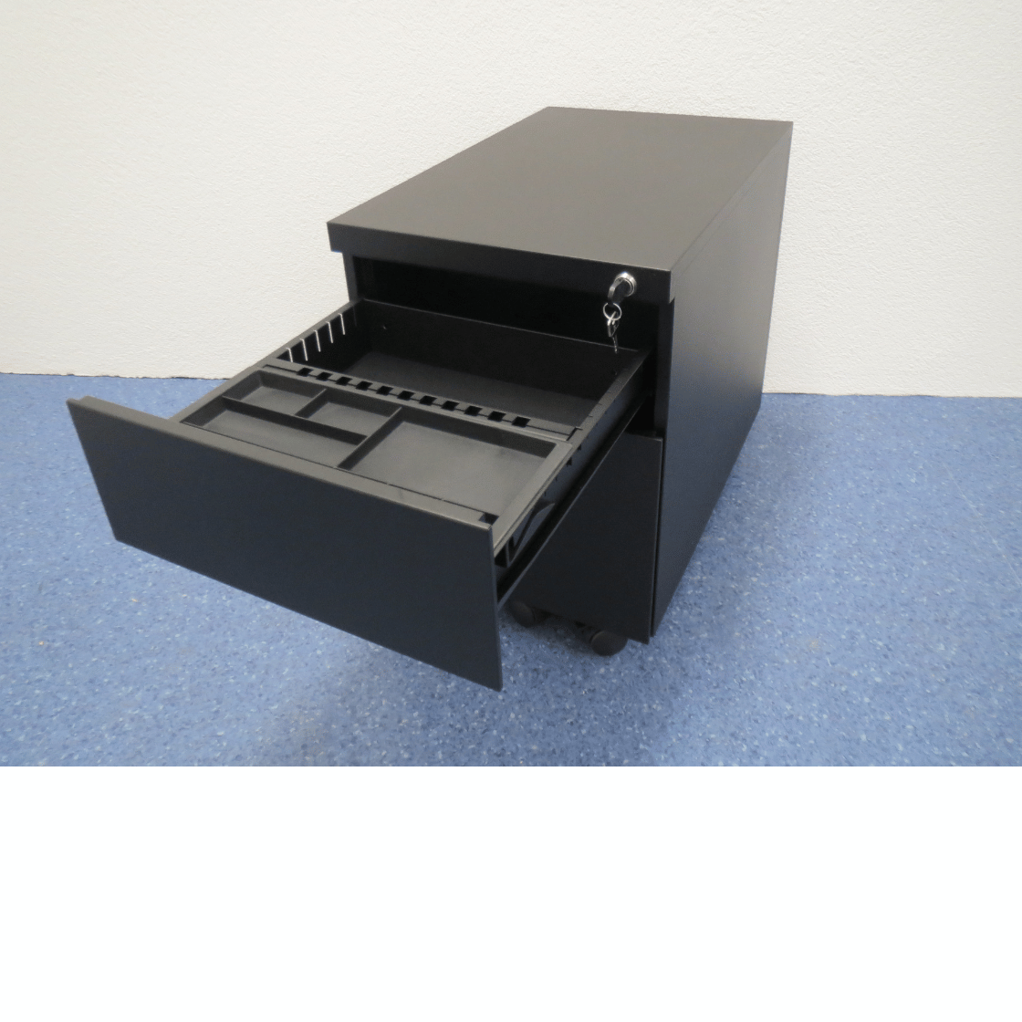 Die Korpusse sind abschliessbar und verfügen über Rollen für einfache Mobilität. Sie ermöglichen eine sichere Aufbewahrung von Dokumenten und Materialien. Die Einteilung umfasst eine A6-Schublade mit eingesetzter Materialschale sowie eine HR-Schublade in neuem Zustand aus Liquidation.